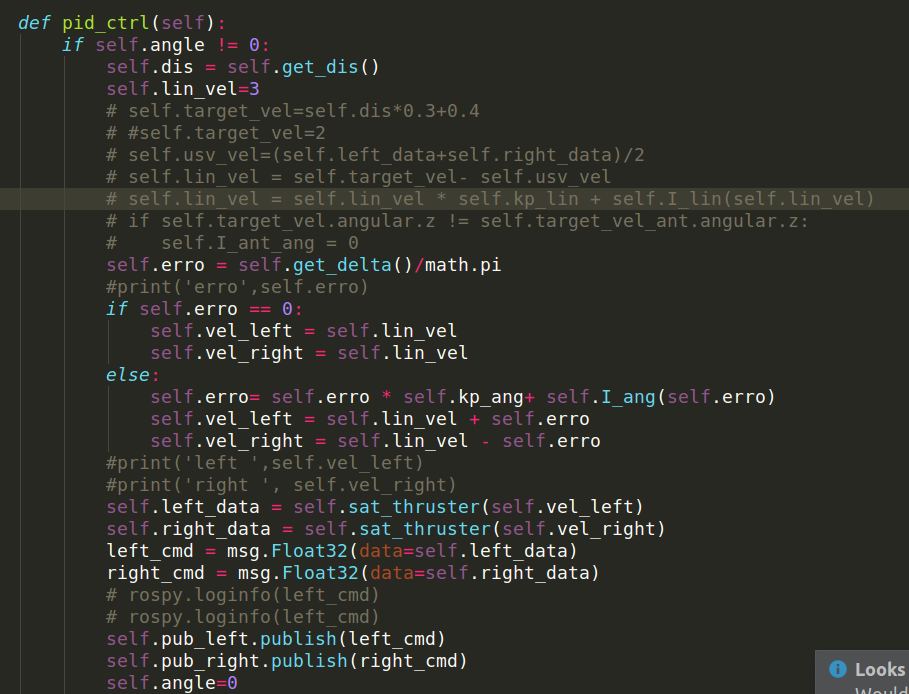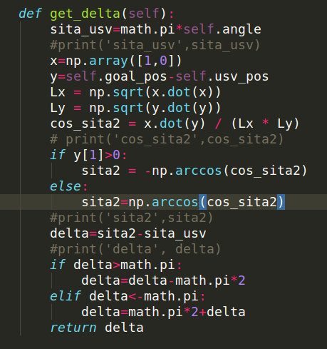 3、计算无人艇当前航向与目标航向的角度差。求目标航向角时用到了向量的夹角公式,向量x为x轴正方向单位向量,向量y为船到目标点。x.*y=|x||y|cos(sita),注意arccos求出来范围是0-pi,不能判断向量是顺时针还是逆时针方向,所以需要额外进行符号判断。另外,由于角度差可能会大于pi或小于-pi,也许呀进行规范。