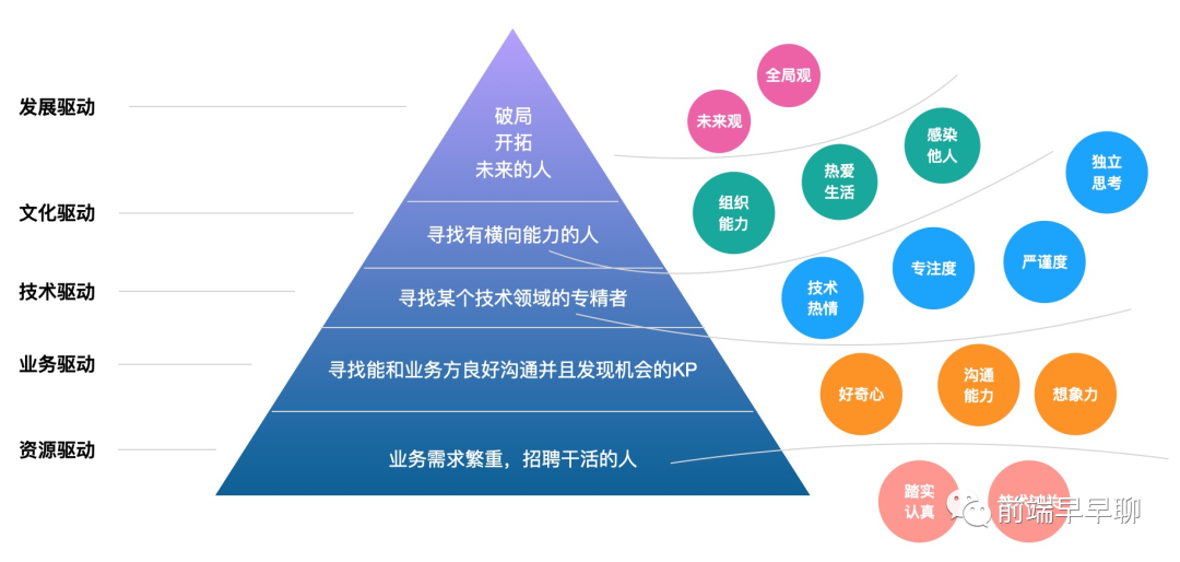 第五层,一个团队在某一块领域已经耕耘比较成熟了。在这个情况下要寻找破局的人,在营销搭建已经做得非常成熟了,接下来的未来是什么呢?在前端工程化,做各种 Webpack 打包,做各种命令行工具,前端的开发效率提升了,那么接下来干什么呢?为什么我放在最顶层了呢?因为招人它的要求是我觉得是最高的。在这个层面的人可能是要承担一个破局的人,他不是一个守成的人,守成的人是把现有的事情能够做好,能够维护好。破局的人做的其实是一个开拓的角色,要非常有未来观、有全局观的人。在这个层面,它其实是一种对团队的发展的考虑,是这么一个目的,叫做发展驱动。