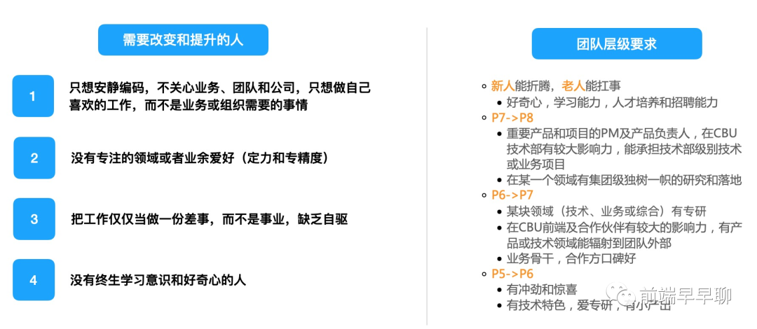 P6 到 P7,到P7的话其实你已经是技术专家的。你在某一块领域,在无线技术,在性能优化,在跨端技术,在工程技术,在数据可视化领域,在数据分析,或者你在技术领域没有,那你在一些业务理解、产品 Sense 上你都比别人要明显的强,有明显的结果。这就是一个 P6 到 P7 的要求。这一块可能并不需要说在整个技术部有影响,但是你在大团队,你在这 100 来个人的大前端团队里面,你有没有影响力和先进性?你做的东西能不能分享到团队以外?你做的东西能不能被其他团队使用或借鉴?