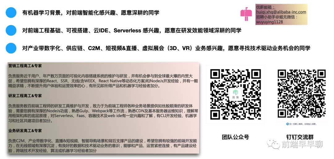 第一个,是因为我的 智能化方向 ,我现在需要的人是有机器学习背景或者感兴趣的,前段时间也招了一些社招的同学,也有这个背景,我也希望在座的各位有更多的人能加入到前端智能化阵营里面。怎么让前端开发能够更快,能够通过图像技术能够自动生成代码,甚至说我把这些经验都沉淀下来了,对买家的页面,我能不能实时的自动化的生产,我通过跟 UED 的合作把行业数字化的经验沉淀下来,是不是页面都不用开发了?大家只要做好一些基本的素材就好了。