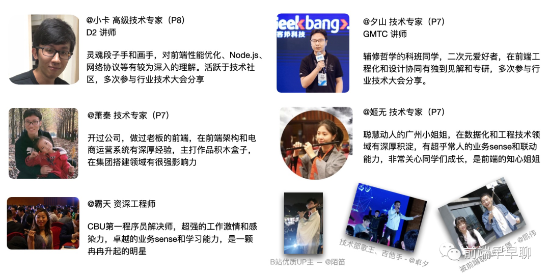 团队有非常多的牛逼的人,非常多有意思的人, 我自己觉得最好的工作环境,其实不是说你比如说你这个公司装修的怎么好,我觉得最好的工作环境就是你周围的人,是不是一群牛逼的人,周围的人能不能让你成长呢 ?甚至这个团队的业务好不好反而还不是第一位,因为业务这个东西,他的好坏是不是你的结果,这个都很难说。但是一个人的发展好不好,一定是可以被周围的人带起来,先富带动后富吗,你是能被周围很多人感染到的?耳濡目染,能看到周围很多人做的事情,怎么做事情的。这一点是非常重要的。我非常自豪,就是团队有很多牛逼的人,比如说 小卡、夕山、萧秦,姬无、霸天 , 姬无 后面也会给大家去做一次分享, 霸天 ,就是现在的主持人,她之前也给大家做过分享,团队还有很多有才艺的人,比如说 B 站的 UP 主,技术部的歌王,还有一些被前端耽误的主播,都是一群非常有意思的人。