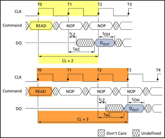 模式寄存器中的CASLatency是指列地址选通延迟,简称CL。在发出读命令(命令同时包含列地址)后,需要等待几个时钟周期数据线DQ才会输出有效数据,这之间的时钟周期就是指CL,CL一般可以设置为2或3个时钟周期,见图 26 -9。