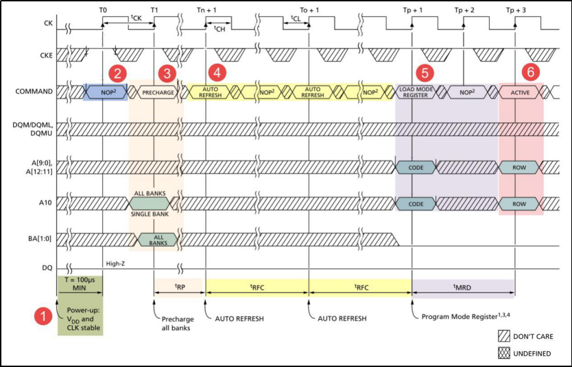 最后我们来了解SDRAM的初始化流程。SDRAM并不是上电后立即就可以开始读写数据的,它需要按步骤进行初始化,对存储矩阵进行预充电、刷新并设置模式寄存器,见图 26- 10。