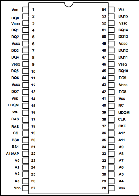 SDRAM包含有“A”以及“BA”两类地址线,A类地址线是行(Row)与列(Column)共用的地址总线,BA地址线是独立的用于指定SDRAM内部存储阵列号(Bank)。在命令模式下,A类地址线还用于某些命令输入参数。
