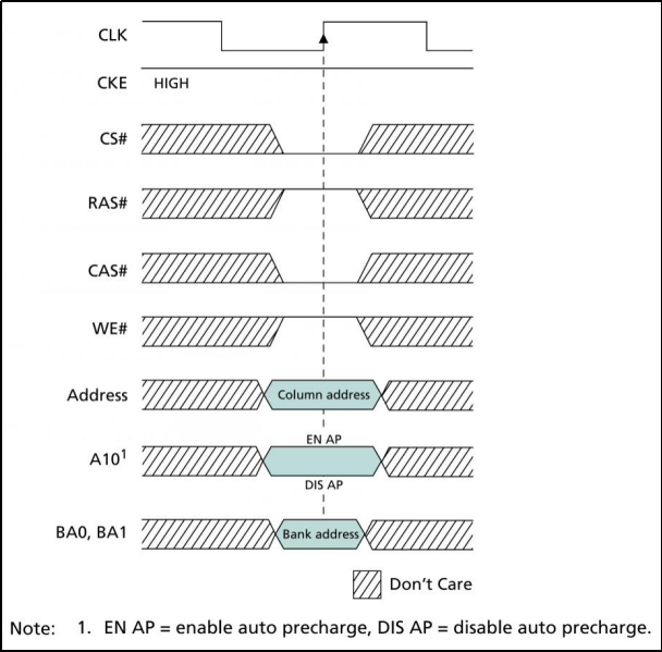 本型号的SDRAM芯片表示列地址时仅使用A[8:0]线,而A10线用于控制是否“自动预充电”,该线为高电平时使能,低电平时关闭。
