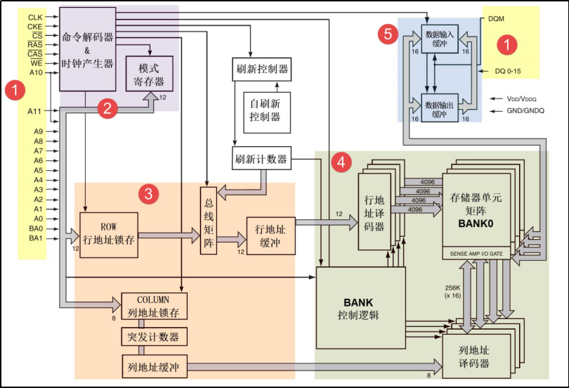 若是写SDRAM内容,寻址完成后,DQ[15:0]线表示的数据经过图 26 2标号…中的输入数据寄存器,然后传输到存储器阵列中,数据被保存;数据输出过程相反。