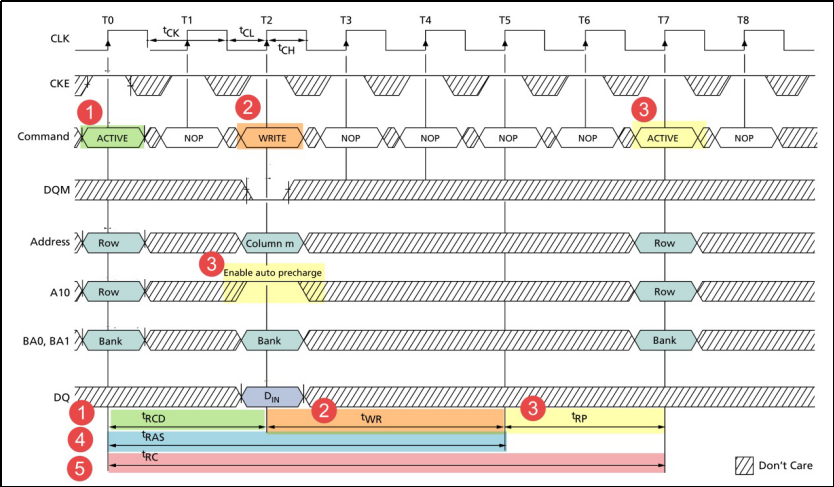 SDRAM 的寻址具有独占性,所以在进行完读写操作后,如果要对同一个Bank 的另一行进行寻址,就要将原来有效(ACTIVE)的行关闭,重新发送行/列地址。Bank 关闭当前工作行,准备打开新行的操作就是预充电(Precharge)。