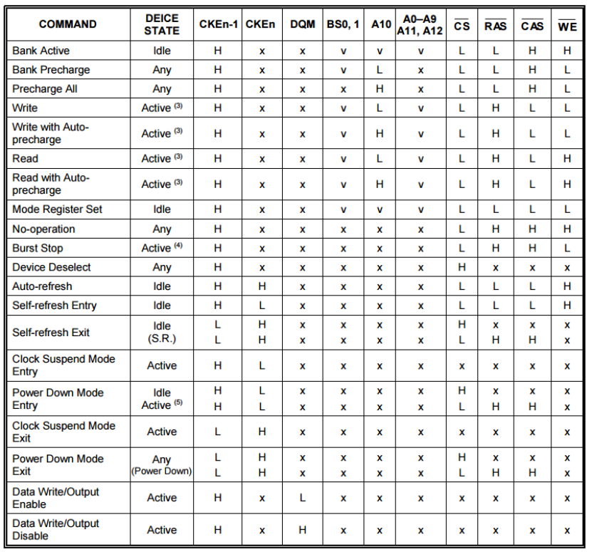 控制SDRAM需要用到一系列的命令,见表 26 -2。各种信号线状态组合产生不同的控制命令。