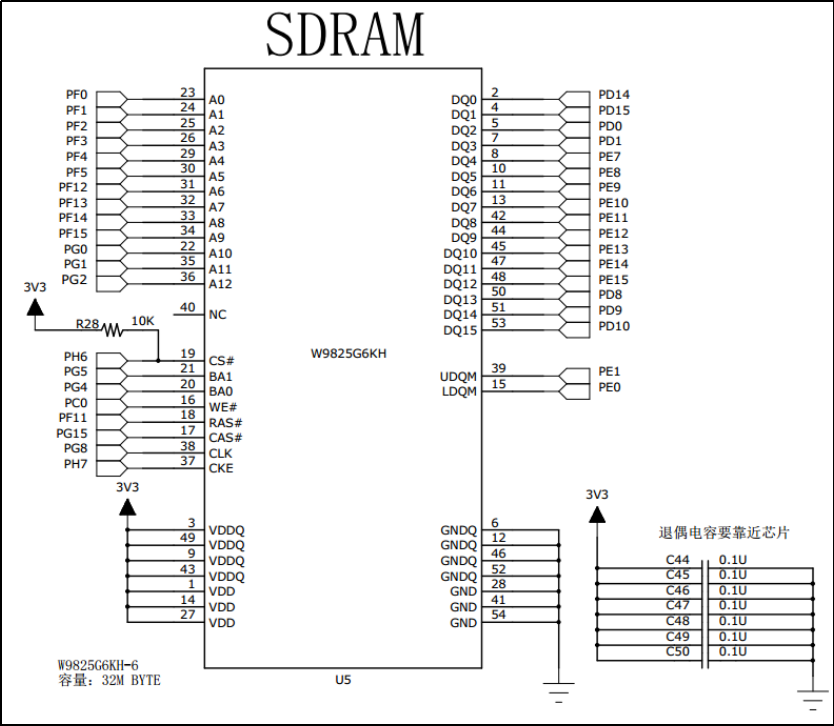 关于SDRAM存储器,请参考前面的“常用存储器介绍”章节,实验中SDRAM芯片的具体参数,请参考其规格书《W9825G6KH》来了解。