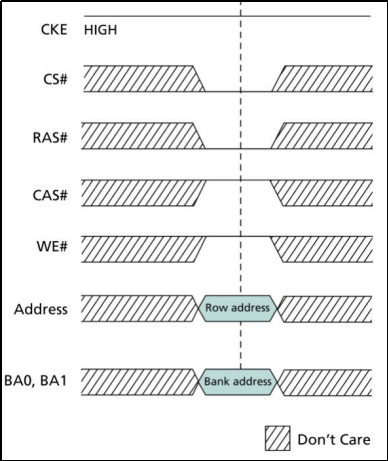 进行存储单元寻址时,需要先选中要访问的Bank和行,使它处于激活状态。该操作通过“行有效”(ACTIVE)命令实现,见图 26 -5,发送行有效命令时,RAS线为低电平,同时通过BA线以及A线发送Bank地址和行地址。