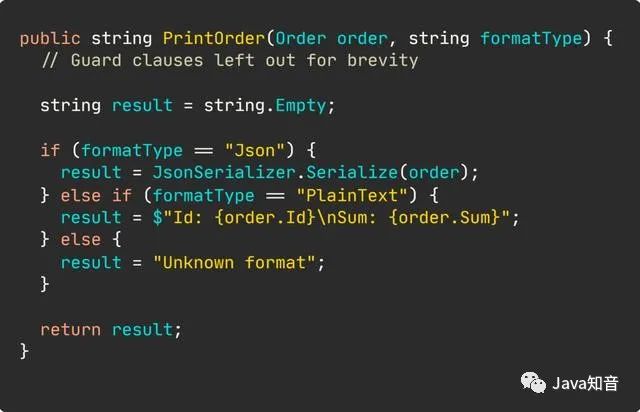 举这个说明性的例子。在这里,我们需要将Order实例显示为字符串。首先,我们只有两种字符串表示形式:JSON和纯文本。在此阶段使用If-Else并不是什么大问题,如果我们可以轻松替换其他,只要如前所述即可。