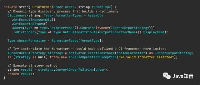 首先,获取实现通用接口IOrderOutputStrategy的程序集中的所有类型。然后,我们建立一个字典,格式化程序的displayName的名称为key,类型为value。