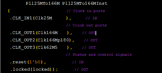 时钟的输入来源于外部晶振,时钟频率为25MHz,通过PLL产生数据源的时钟62.5MHz和sdram的工作时钟166MHz。另外还需要产生一个相移为180°的166MHz提供给下游芯片sdram,保证时钟在数据中间采样。