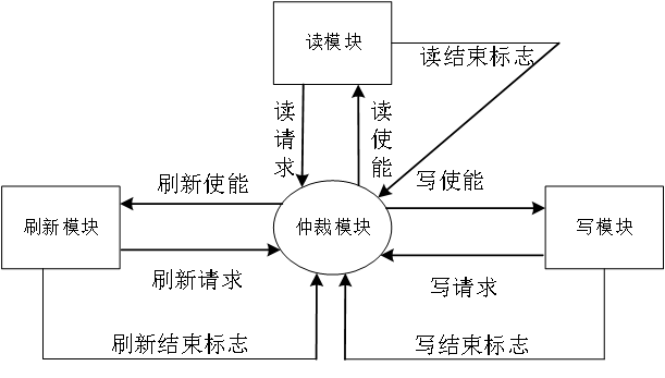 SDRAM 有三种必需的操作: 刷新操作、读操作和写操作。这三种操作之间的协调及相互转换就引入了“仲裁机制”。在需要刷新的时候,给出刷新请求,仲裁模块给出使能信号。在需要读取数据的时候,接收外部的读请求,然后仲裁模块给出响应,写入数据操作类似。如图13所示。