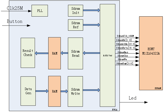 每次读取256个数据(sdram的一行),将前255个数据的累加和与第256个数据比较,如果相等,则表示无误码,led灯不点亮;否则,led保持亮1s。顶层框图如图5所示,valid表示输入的有效数据,led为1-bit输出点亮灯板。