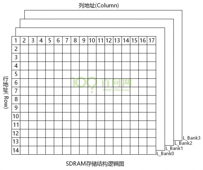根据SDRAM芯片的列地址线数目设置CPU的相关寄存器后,CPU就会从32位的地址中自动分出L_Bank片选信号,行地址信号,列地址信号,然后先后发出行地址信号,列地址信号。L_Bank选择信号在发出行地址信号的同时发出,并维持到列地址信号结束。