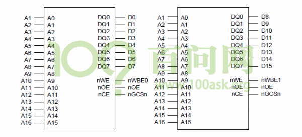 - 16bitROM: 当CPU发出地址(000100),内存控制器会把00010,00011处的地址转发给ROM,ROM会把得到的地址00010,00011,上的数据返回给内存控制器,内存控制器会把得到的2个16bit的数据组装成一个32位的数据返回给CPU。