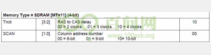 (2)Trcd[3:2]:行地址和列地址间隔多长时间,看芯片手册时间间隔是20ns,本来开发板的HCLK是100MHZ,clocks为10ns,所以设置为推荐值0b00(2clocks)。
