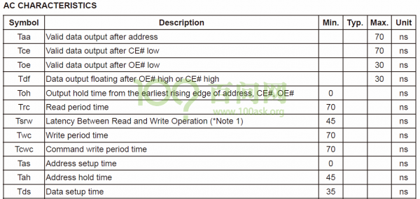 我们需要做的就是设置S3C2440的Nor Flash控制器时序去满足Nor Flash芯片的时序。每个参数的参考范围可以通过AC CHARACTERISTICS得到。