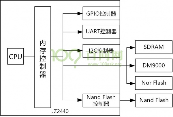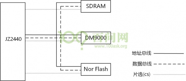 如图,SDRAM、DM9000网卡、Nor Flash都接在JZ2440的数据总线和地址总线上,CPU把数据和地址发送出去,然后内存控制器根据片选信号选择相应的设备接收地址和数据信号,互不干扰。