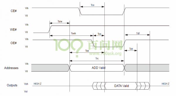 - 发出读信号(OE#)后要等待Toe(要求大于等于30ns)时间,读信号才有效;
