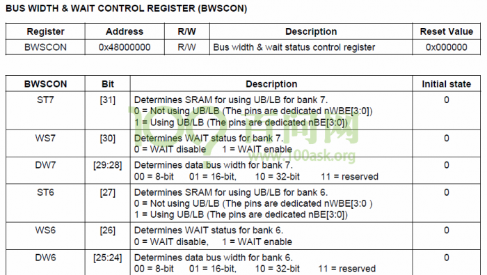 1. 位宽和等待控制寄存器BWSCON(BUSWIDTH&WAITCONTROLREGISTER)