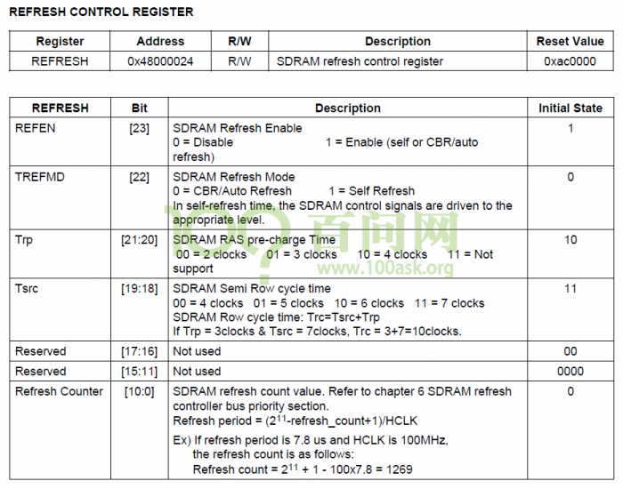 (1)REFEN[23]:0=禁止SDRAM的刷新功能,1:开启SDRAM的刷新功能(设置开启SDRAM的刷新功能)。
