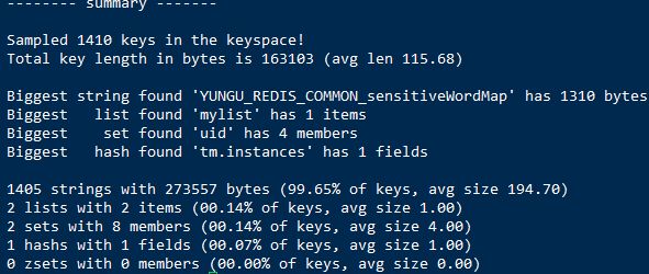 统计 redis 数据存储中比较大的key(用 scan 的方式对 redis 中的 key 进行采样,寻找较大的 keys):redis-cli --bigkeys