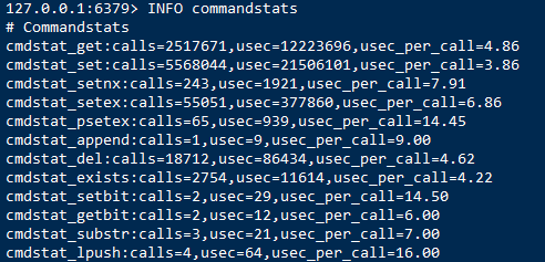 统计命令执行所耗费的毫秒数(每个命令的总时间和平均时间):INFO commandstats