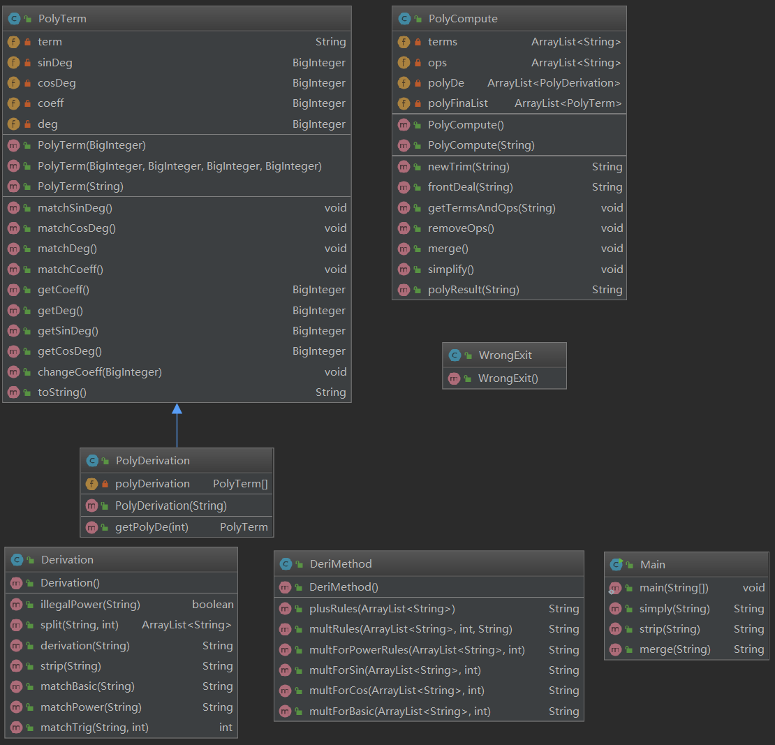 从类图可以看出来,这很不OO,这是一次比较难受的迭代开发,我主要增设了求导方法和求导(递归)两个类,主类的方法也进行了大量的修改(主要体现在开头就进行了