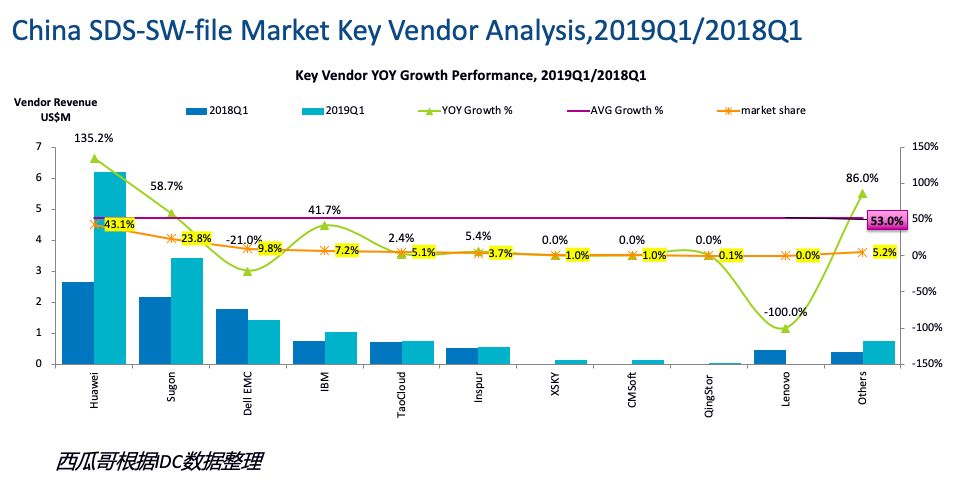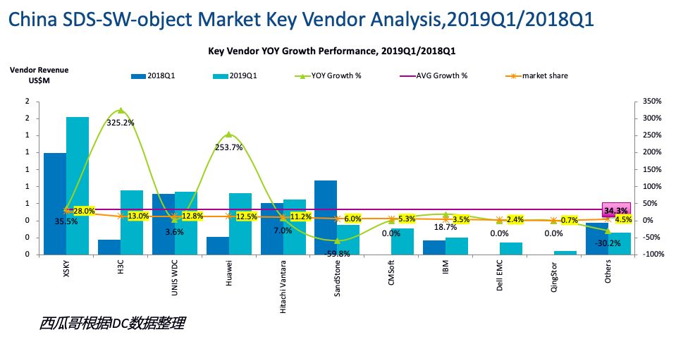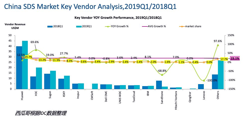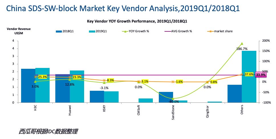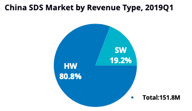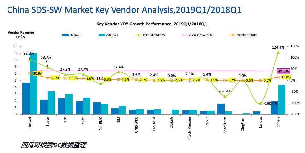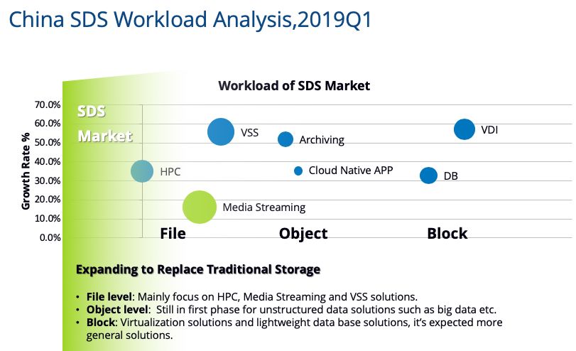 我们看到,只看软件,中国的19Q1 SDS市场同比年增长率约43%,还是非常高的。市场的格局也发生一些变化,比如Sugon和H3C名次互换,但整体变化不大,比如Huawei还是第一,XSKY还是第四。