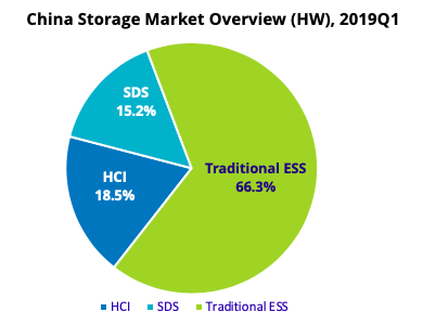 从硬件的比例看,现在中国存储市场还是传统的磁盘阵列占据绝对份额,但SDS和HCI在快速替代传统存储,很多SDS厂商最近也纷纷推出SDS一体机对标传统存储来加快蚕食这个市场。由于传统存储的硬件价格昂贵(基本软件一般不收费),而SDS/HCI的价值更多在软件上(硬件只是普通的商用服务器),因此,如果软硬件综合来看,差距应该没有下图那么大。