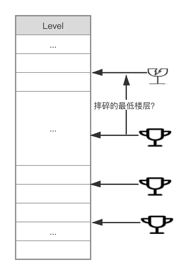 最简单的方法是用一个杯子从第一层开始,不断一层层的往上试。但是这样的时间复杂度是O(n)。直觉也告诉我们想放大楼层间隔扔。