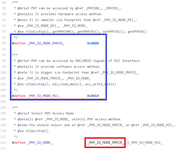- WIZCHIP PHY访问模式配置如下图所示,选择蓝色框中定义的以太网PHY访问模式的两种方法之一,并将其定义为红色框。