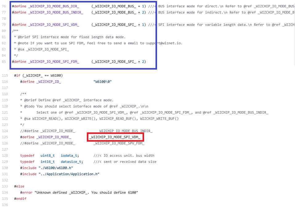 - 选择用户将用于WIZCHIP Access的主机接口(并行总线,串行总线模式等)。在下图中,选择蓝色框中的列表之一,并将其选定为_WIZCHIP_IO_MODE_,如红框。