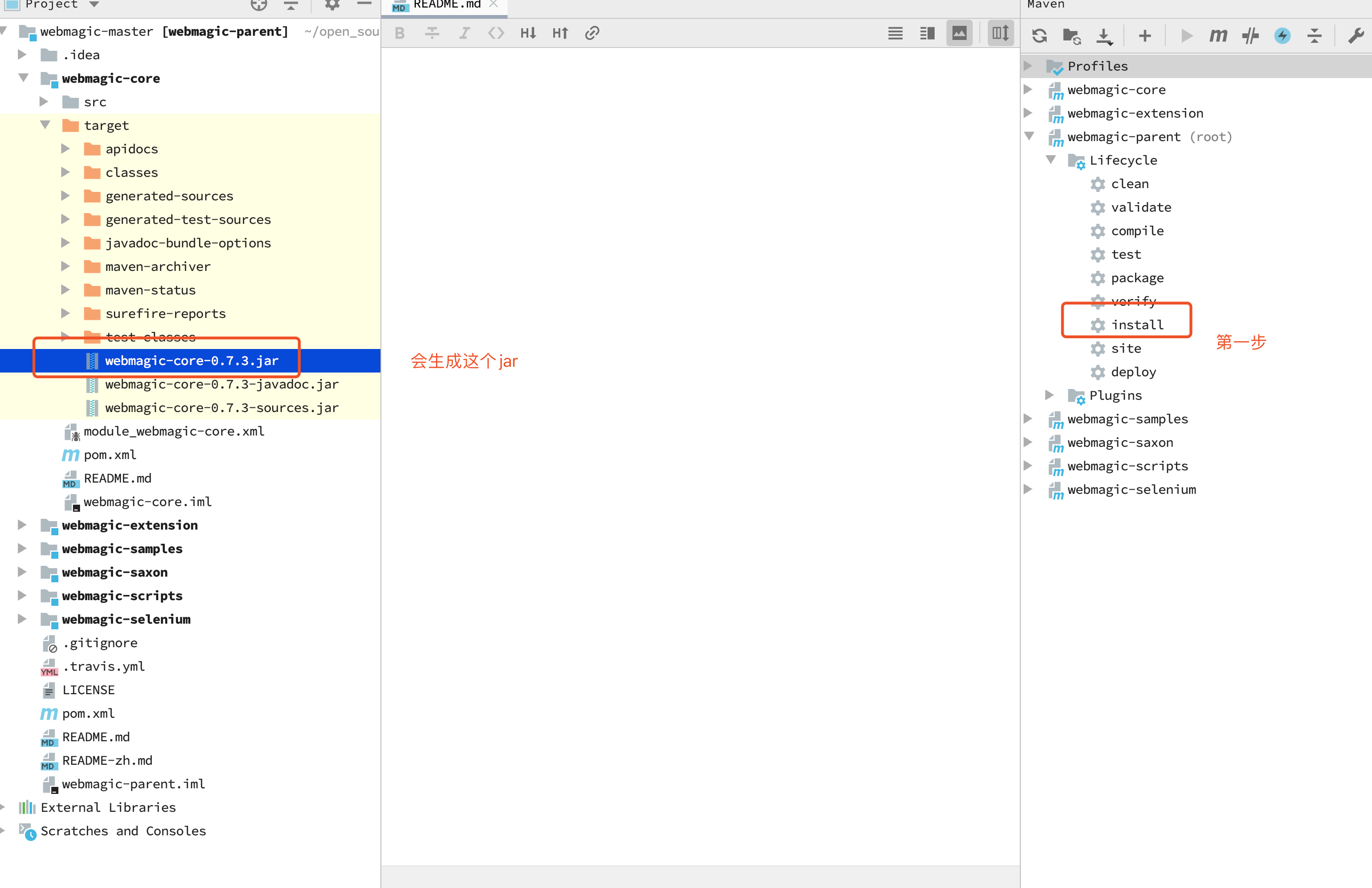 然后IDEA运行mvn install 构建每个模块找到webmagic-parent最开始的进行构建