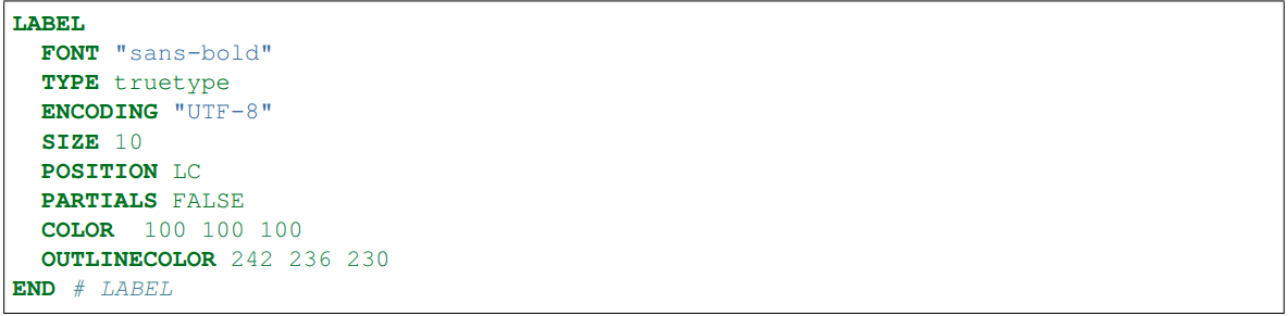 • 在Layer对象中的Labelitem参数可以用来指定为数据的标签的属性。标签以FONT显示,在FONTSET文件(设置在Map对象里)中声明。FONTSET文件包含对可用字体名的引用。ENCODING描述了文件中使用的哪个编码(请参见MapServer中的国际字符显示)。
