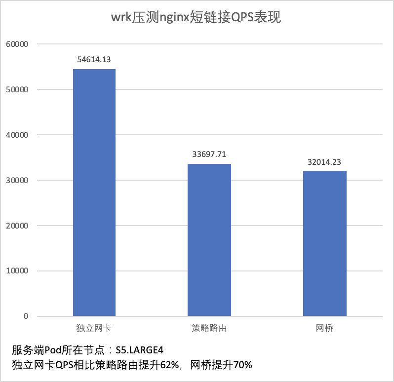 腾讯云容器服务 TKE 借助智能网卡推出下一代容器网络方案,该方案实现了一个 Pod 独占一张弹性网卡,不再经过节点网络协议栈(default namespace),极大缩短了容器访问链路,缩短了访问时延,并使 PPS 可以达到整机上限。该方案实现了短链接场景下 QPS 相比之前容器网络方案(策略路由方案,网桥方案)提升 50%-70%;长链接场景下 QPS 提升 40%-60%。