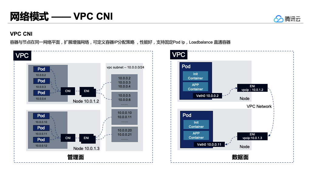 VPC-CNI 模式: TKE 基于 CNI 和 VPC 弹性网卡实现的容器网络能力,适用于 Pod 固定 IP,CLB 直通 Pod,Pod 直绑 EIP 等场景。该网络模式下,容器与节点分布在同一网络平面,容器 IP 为 IPAMD 组件所分配的弹性网卡 IP。
