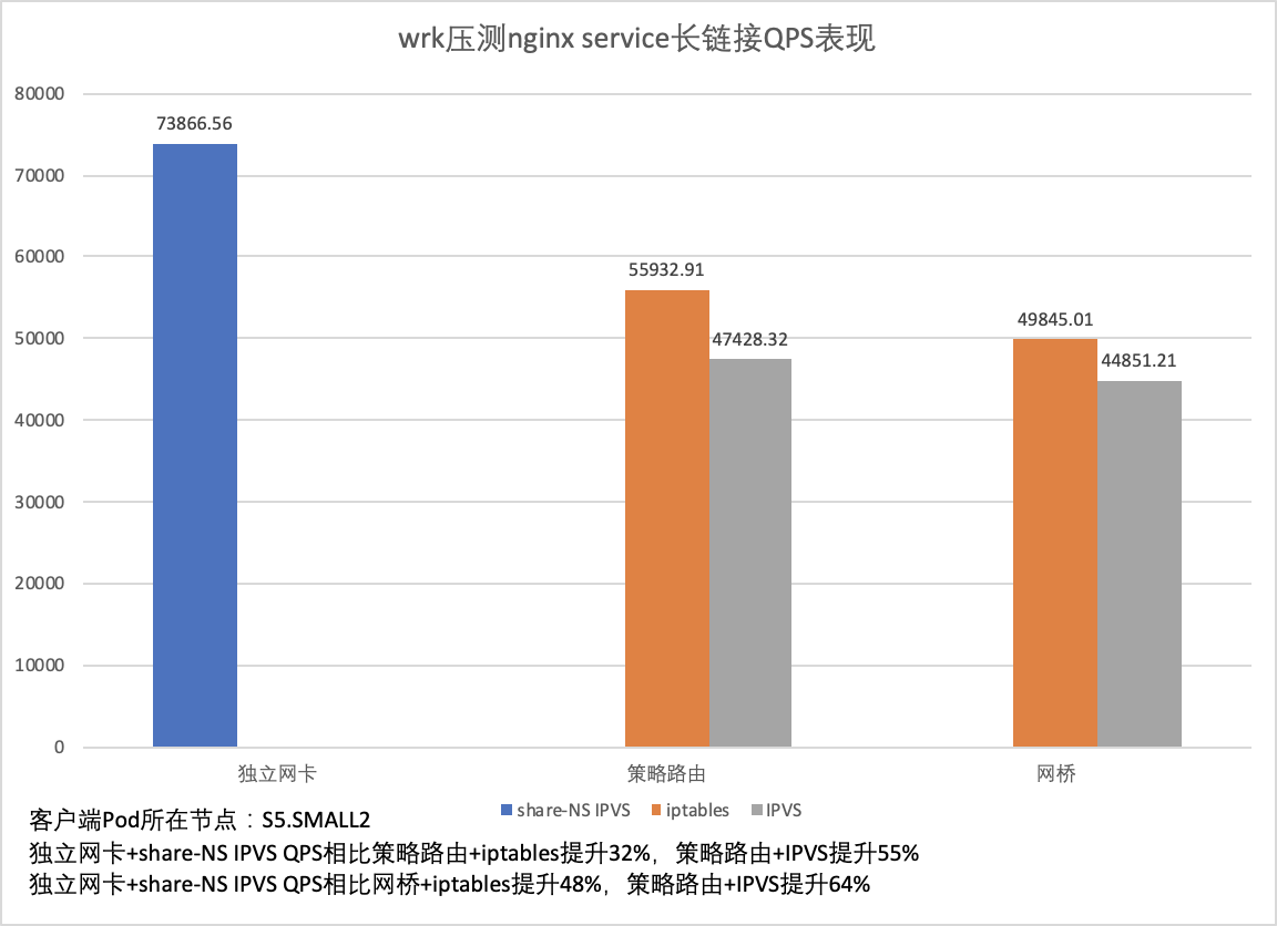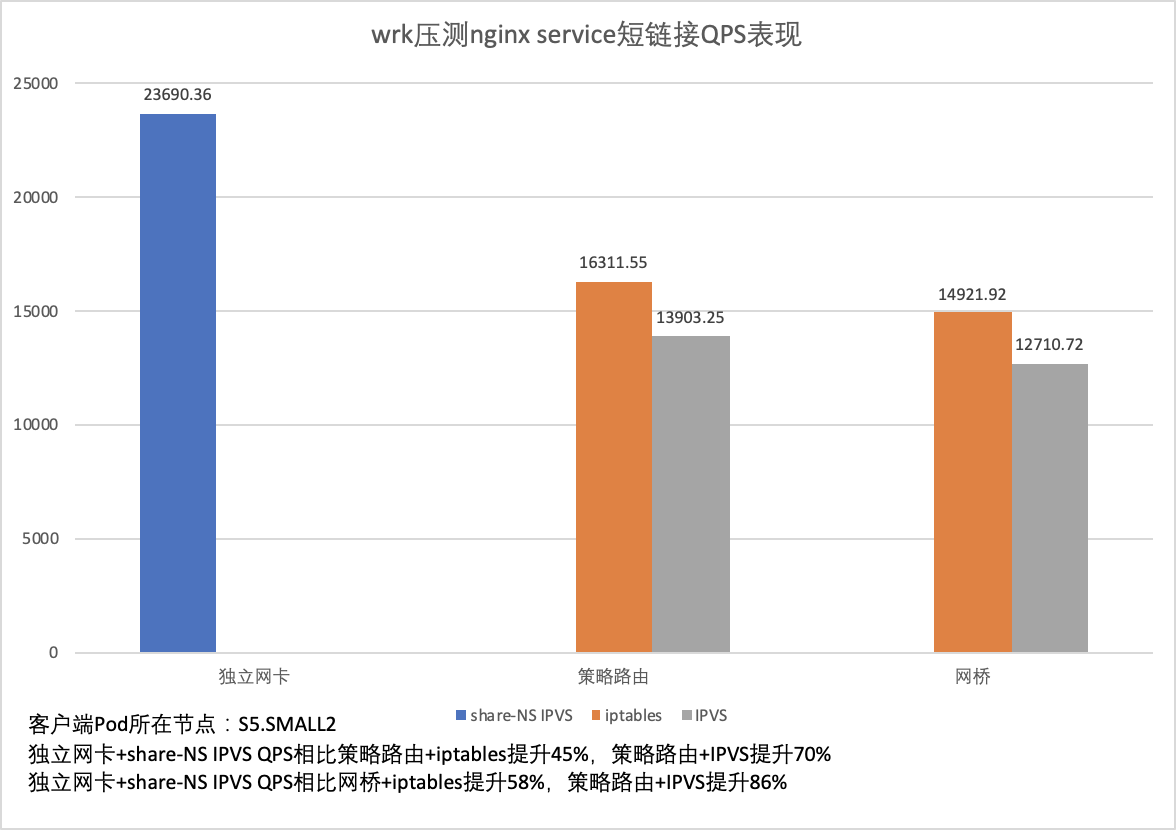 该方案实现了针对 ClusterIP service 短链接场景下 QPS 相比 iptables 方案提升 40%-60%,IPVS 方案提升 70%-90%;长链接场景下 QPS 相比 iptables 方案提升 30%-50%,IPVS 方案提升 50%-70%。
