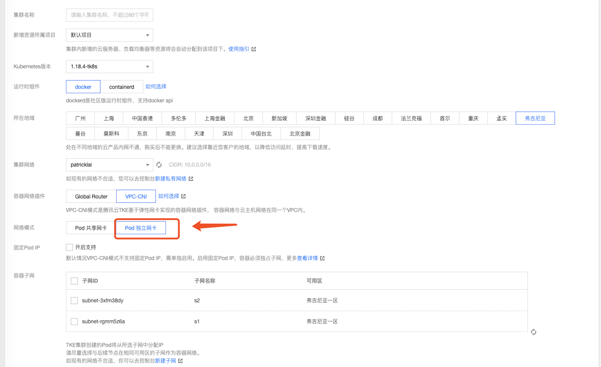 申请新一代容器网络方案内测开通后,创建 TKE 集群时容器网络模式选择 VPC-CNI/Pod 独立网卡模式即可: