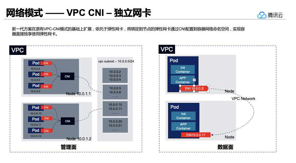 基于以上场景,TKE 团队联合底层腾讯云 VPC 团队、虚拟化团队推出了新一代的独立网卡的 VPC-CNI 方案。