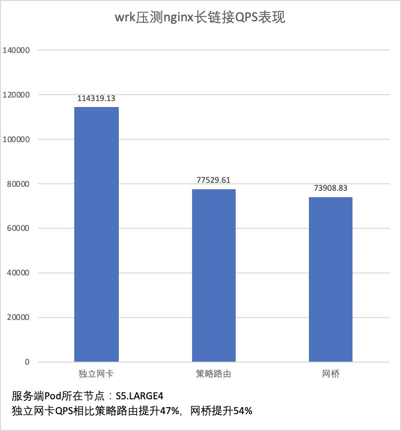 为了得到不同网络方案下的 QPS,这里控制变量,让不同网络方案的 nginx Pod 运行在同一个节点,使用 wrk 分别压测不同 Pod,并让服务端节点的 cpu 接近100%。