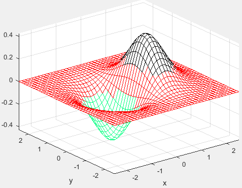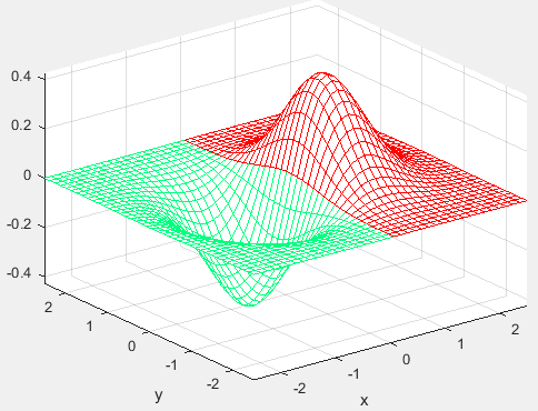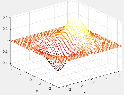 ezmesh(x*exp(-x^2-y^2),[-2.5,2.5],40);