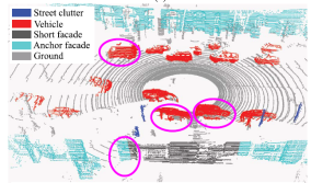传感器:VLP-64 主要工作:完整的激光雷达语义环境感知方案,通过将点云投影到地面栅格图,按照点的密度和最高高度、最大高度差,将点云分为建筑物表面、低矮物体、较高物体,而后按照点云的密度变化将点云进行聚类,再讲点云按照最大面积的方向,投影为90*90的深度图,通过CNN进行分类,最后一步是按照环境的语义信息进行分类结果的纠正,修正点云聚类等造成的错误。