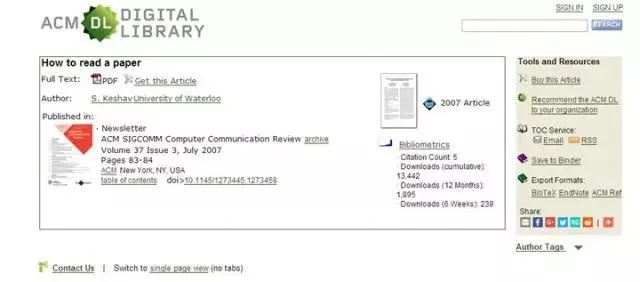 来自滑铁卢大学教授S. Keshav的论文《How to Read a Paper》中提出的阅读学术论文的三步法是人们比较认可的阅读技巧。图为该论文信息