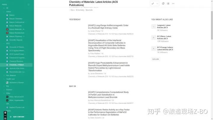 我本身是做高分子化学的,所以我会关注Nature, Science和ACS关于材料和材料化学的杂志,欧洲的就会去看Royal Chemical Society和Wiley的一些杂志。