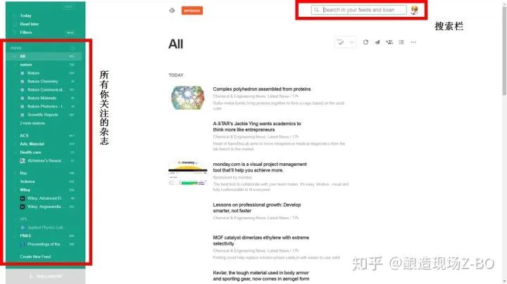 这个网站使用起来非常简单,你只需要搜索你想关注的杂志,或者把想关注的杂志的RSS链接加入到你的账号里就可以了。
