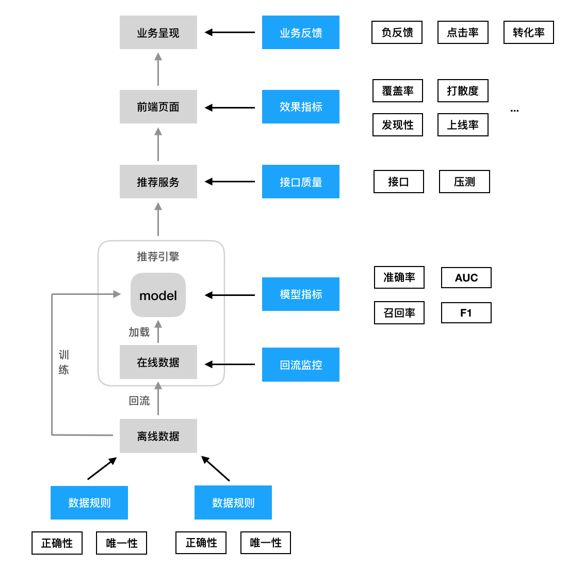 接下来说下如何保证这块的质量。由于推荐系统最终对用户需要提供实时的服务化,因此免不了有工程端的技术需要一起配合。因此我这块主要分为两个维度来开展,一方面是工程端的质量保证,一方面是算法侧的质量保证。