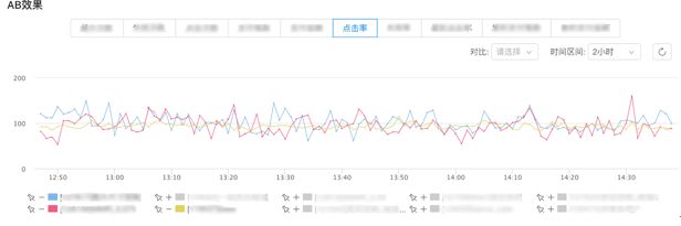 Click-Througt-Rate,即点击率,点击数/曝光数。推荐算法效果的最最重要指标,没有之一。一般算法好不好,都会直接用这个指标直接定义。通常算法模型在迭代的过程中都会进行ab test,所谓ab test就是有一个基准桶,一个对比桶,通过收集两个不同方案在用户侧的点击率,来评估算法的好坏,一般来说当流量特别大的时候,基本上一个ab实验上线几分钟就可以出算法的好坏了。当然算法的分桶不仅限只有两个桶,像下面这个推荐每个分桶的数据都可以非常直观的展示出来。一般需要借助像Blink这样的实时计算能力来实时的显示点击率数据。